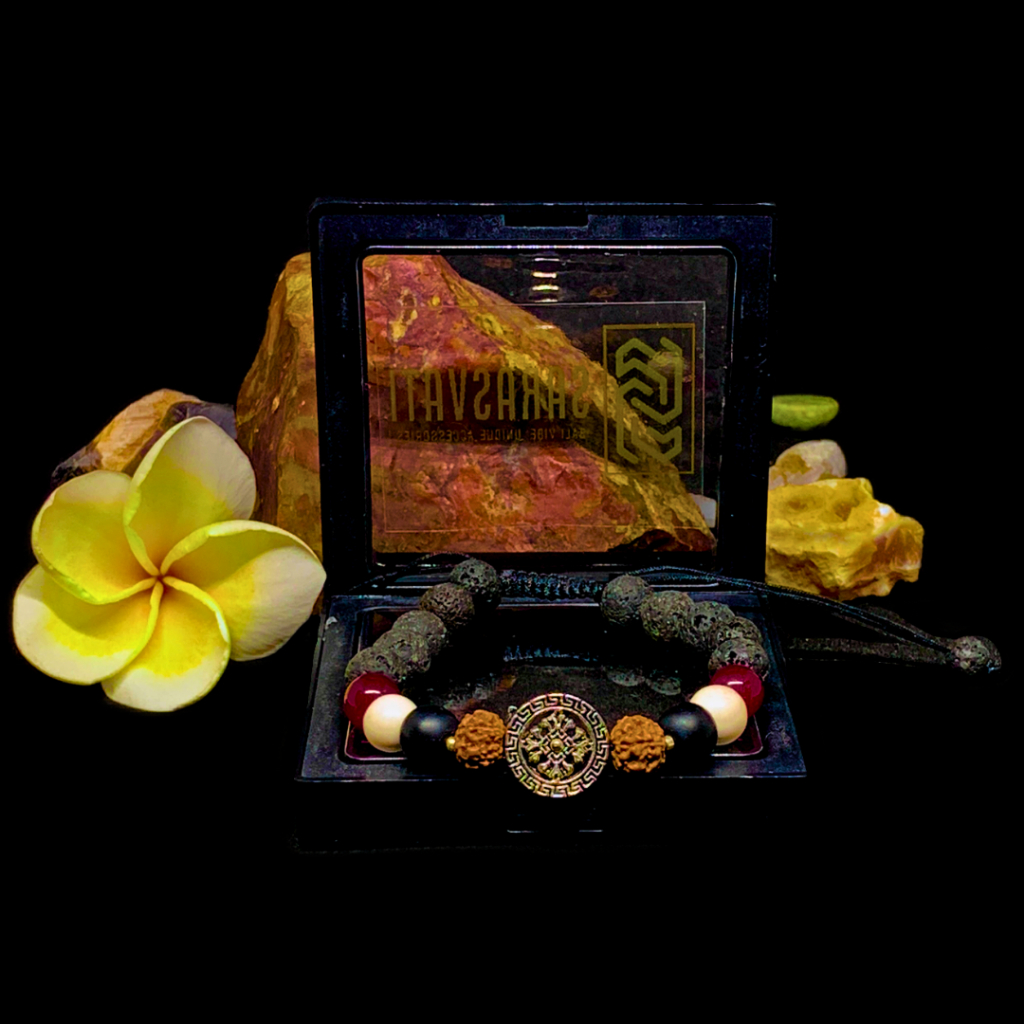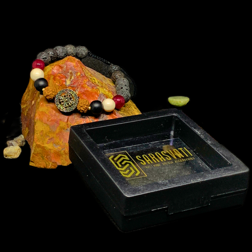 Gelang Batu Alam Tridatu Mandala mewakili kesatuan dari segala hal. Gelang ini menampilkan Mandala sebagai pusat energi yang dikelilingi oleh batu-batu yang mendukungnya. Biji Rudraksha Cokelat melambangkan doa harian, sementara Batu Black Onyx menghadirkan keanggunan abadi dan perlindungan. Batu White Howlite mendorong kedamaian batin, dan Batu Red Agate menghidupkan semangat dan keberanian. Batu Lava Hitam, yang dihiasi dengan kilauan kaca mirip berlian, memberikan kestabilan dan kekuatan.
